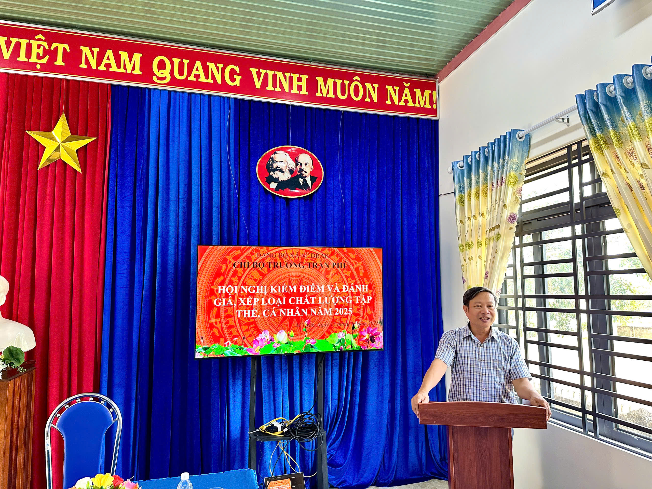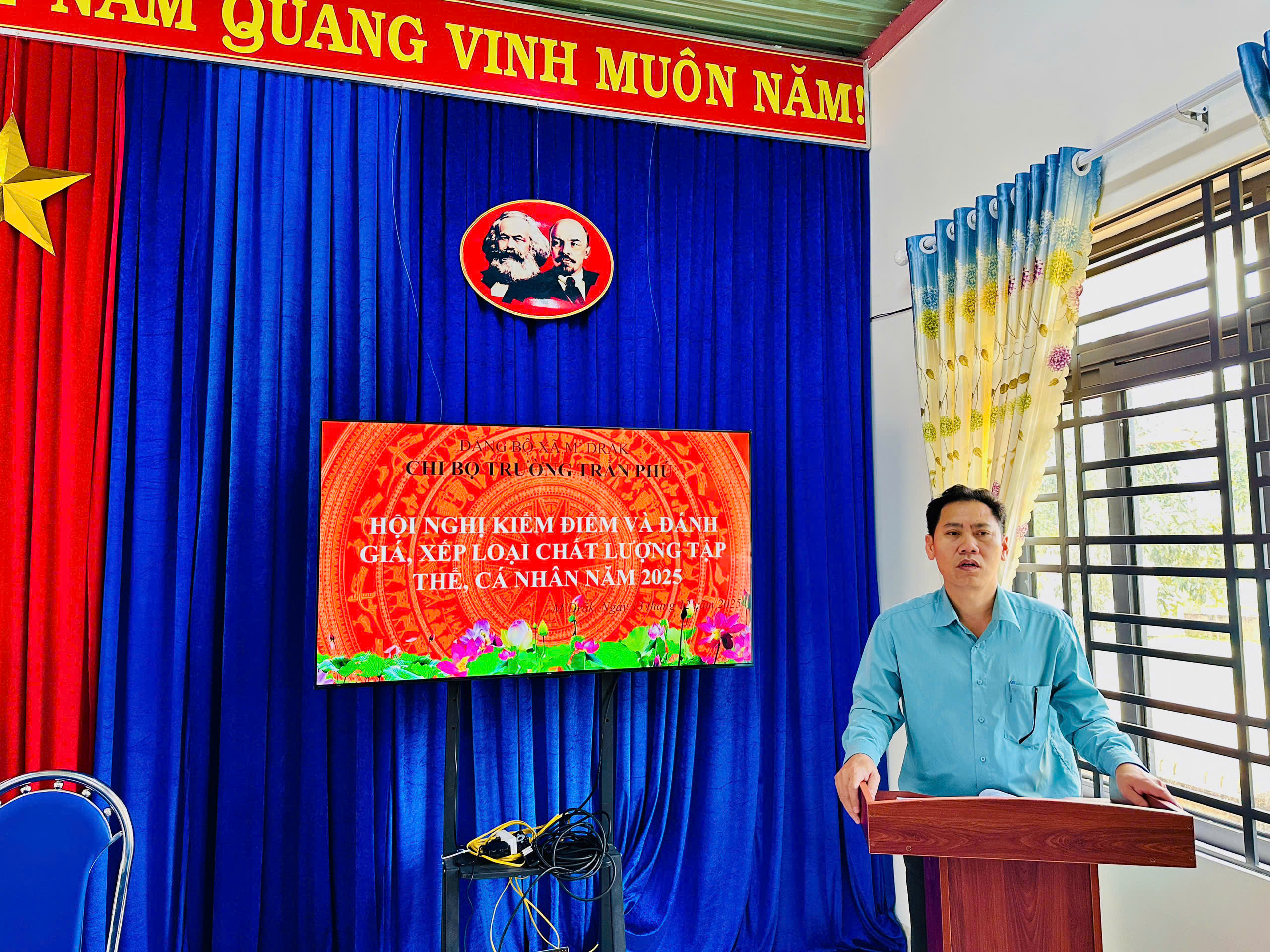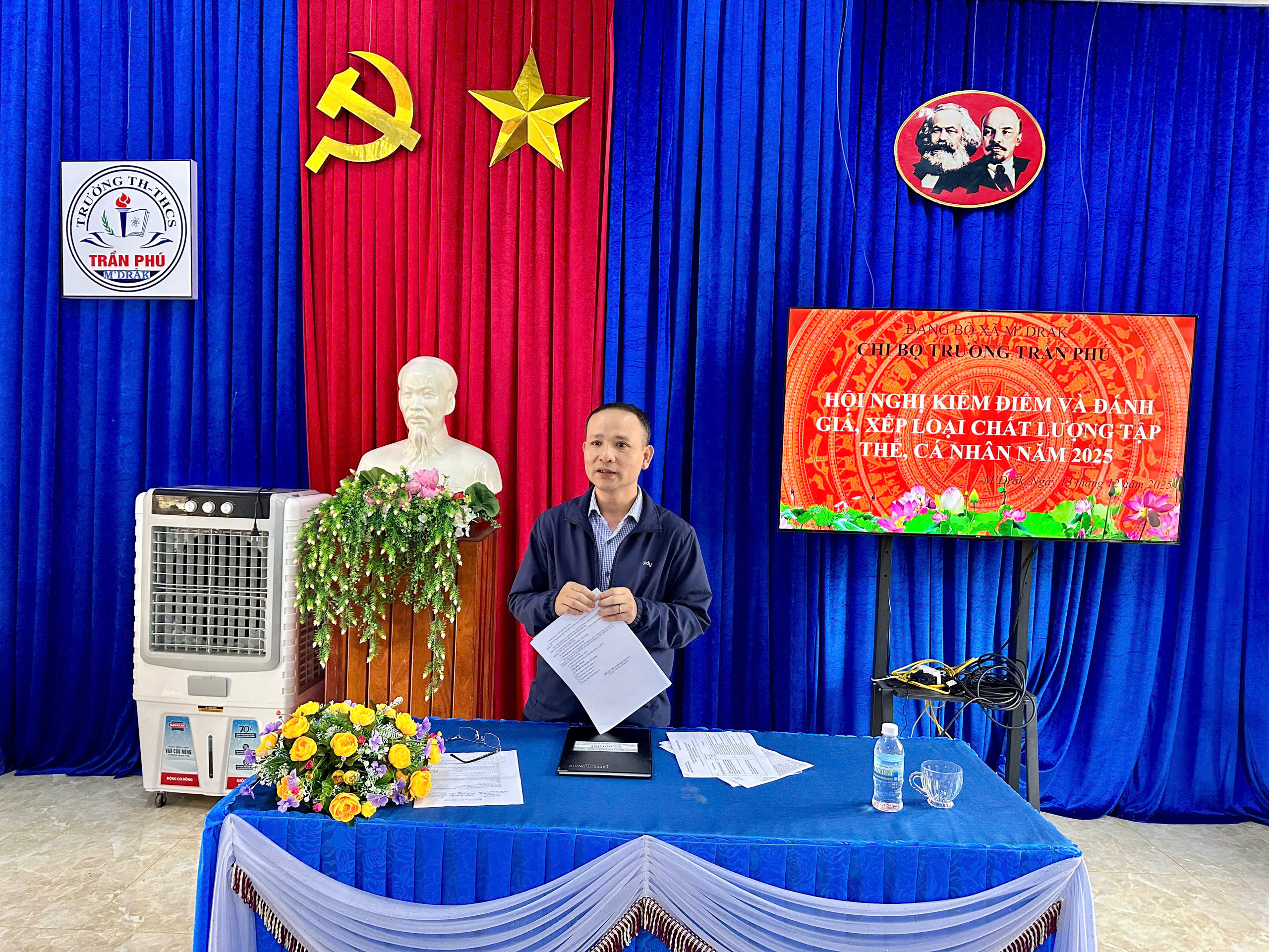 Tại hội nghị, đồng chí Đồng Quốc Dân Phó Bí thư Chi bộ thay măt cấp uỷ đã trình bày Báo cáo kiểm điểm tập thể chi uỷ và tập thể chi bộ Trường TH&THCS Trần Phú năm 2025. Báo cáo được chuẩn bị công phu, bám sát hướng dẫn của cấp trên, đánh giá toàn diện các mặt công tác.