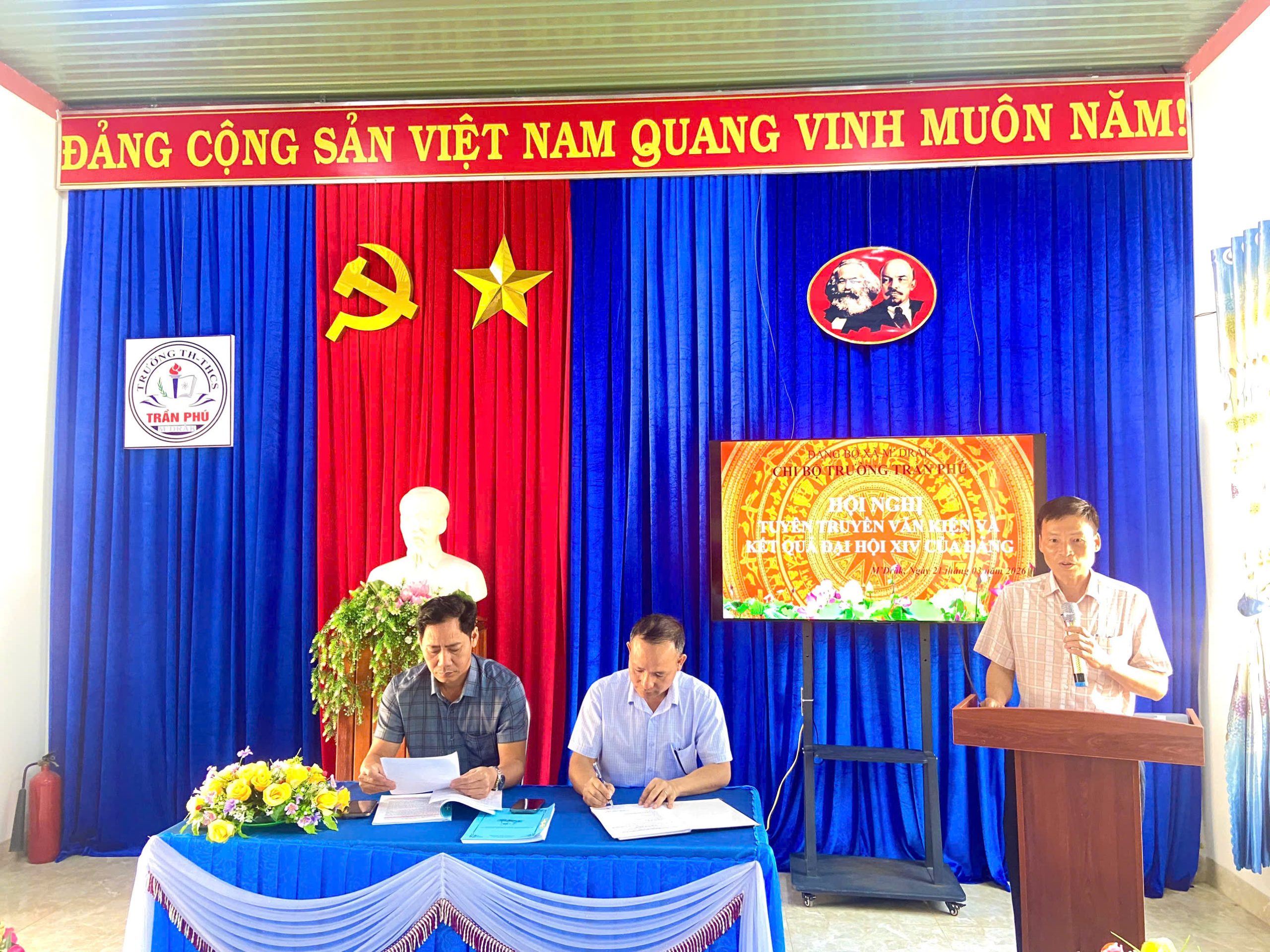 Trong không khí thi đua sôi nổi lập thành tích chào mừng thành công cuộc bầu cử Đại biểu Quốc hội khoá XVI và Đại biểu Hội đồng Nhân dân các cấp nhiệm kỳ 2026-2031, Chiều ngày 20/03/2026, Chi bộ Trường TH&THCS Trần Phú trực thuộc Đảng bộ xã M’Đrăk đã long trọng tổ chức Hội nghị tuyên truyền, quán triệt văn kiện và kết quả Đại hội đại biểu toàn quốc lần thứ XIV của Đảng. Đây là hoạt động chính trị có ý nghĩa đặc biệt quan trọng, góp phần nâng cao nhận thức, thống nhất tư tưởng và hành động trong toàn thể cán bộ, đảng viên, giáo viên, nhân viên nhà trường.