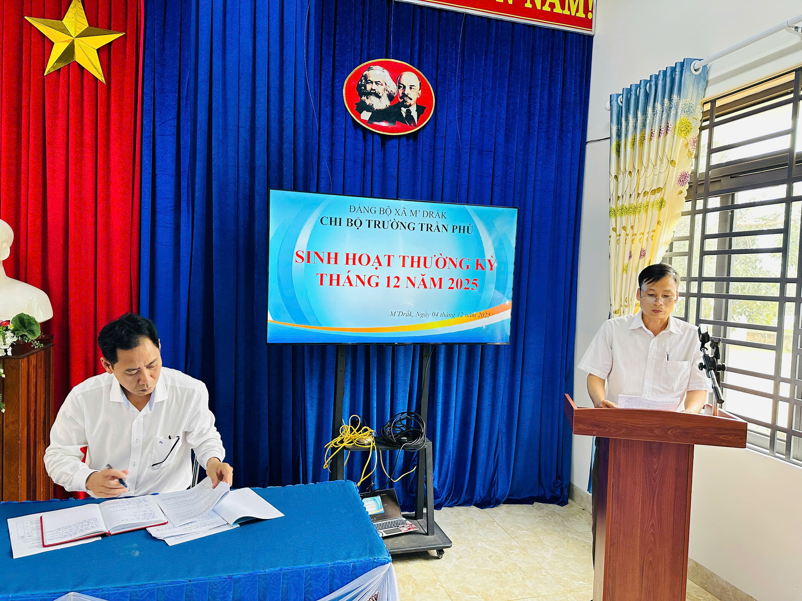 Chiều ngày 04 tháng 12 năm 2025, Chi bộ Trường TH&THCS Trần Phú tổ chức buổi sinh hoạt thường kỳ tháng 12 theo đúng quy định và kế hoạch của Đảng uỷ xã M’Đrăk. Buổi sinh hoạt diễn ra trong không khí nghiêm túc, dân chủ, với sự tham dự của đầy đủ đảng viên trong chi bộ. Đặc biệt, Tổ công tác số 6 của Đảng uỷ xã M’Đrăk do đồng chí Nguyễn Bá Thanh – Uỷ viên Ban Thường vụ, Chủ nhiệm UBKT Đảng uỷ, Tổ trưởng tổ công tác làm trưởng đoàn đã về dự và theo dõi buổi sinh hoạt. Sự có mặt của tổ công tác góp phần tăng tính chuẩn mực và đảm bảo tính nền nếp trong sinh hoạt chi bộ.