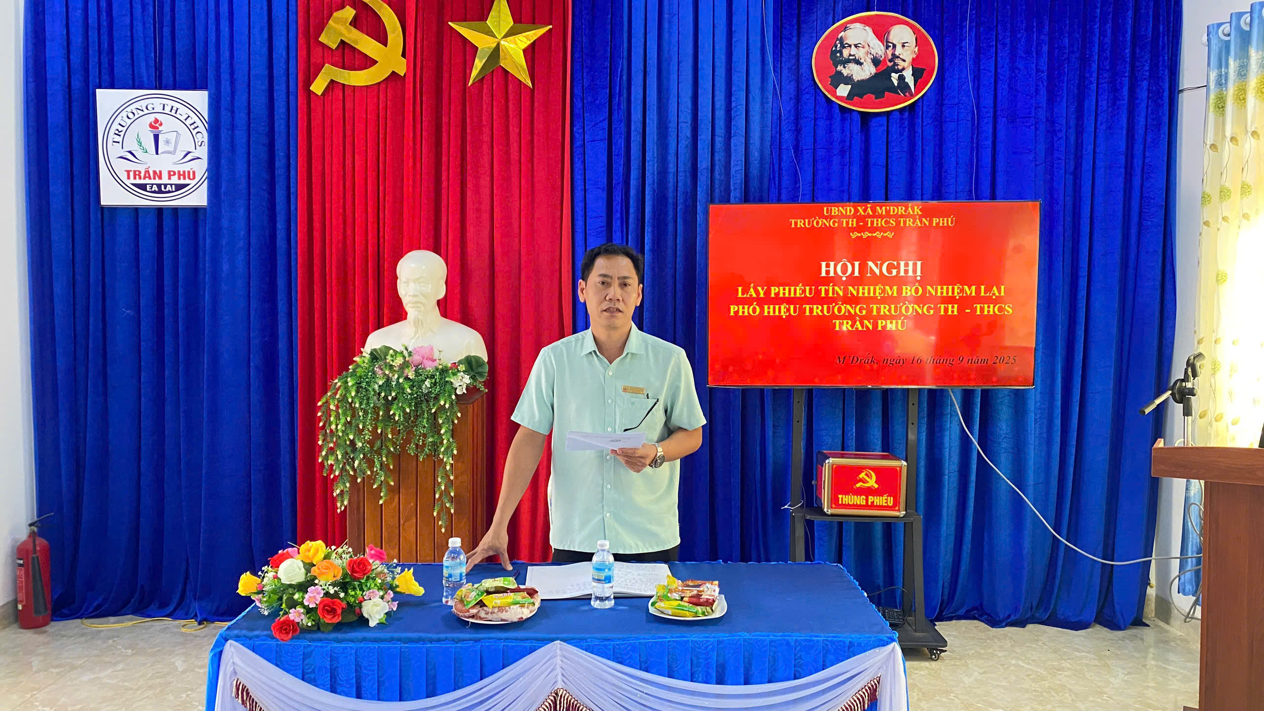 Ngày 16 tháng 09 năm 2025, Trường Tiểu học và THCS Trần Phú, xã M’Đrắk đã tổ chức Hội nghị lấy phiếu tín nhiệm bổ nhiệm lại chức danh Phó Hiệu trưởng đối với đồng chí Đồng Quốc Dân và đồng chí Lương Bá Từ. Tham dự hội nghị có đại diện lãnh đạo UBND xã M’Đrắk, Phòng VHXH, cùng toàn thể cán bộ, giáo viên, nhân viên của nhà trường.