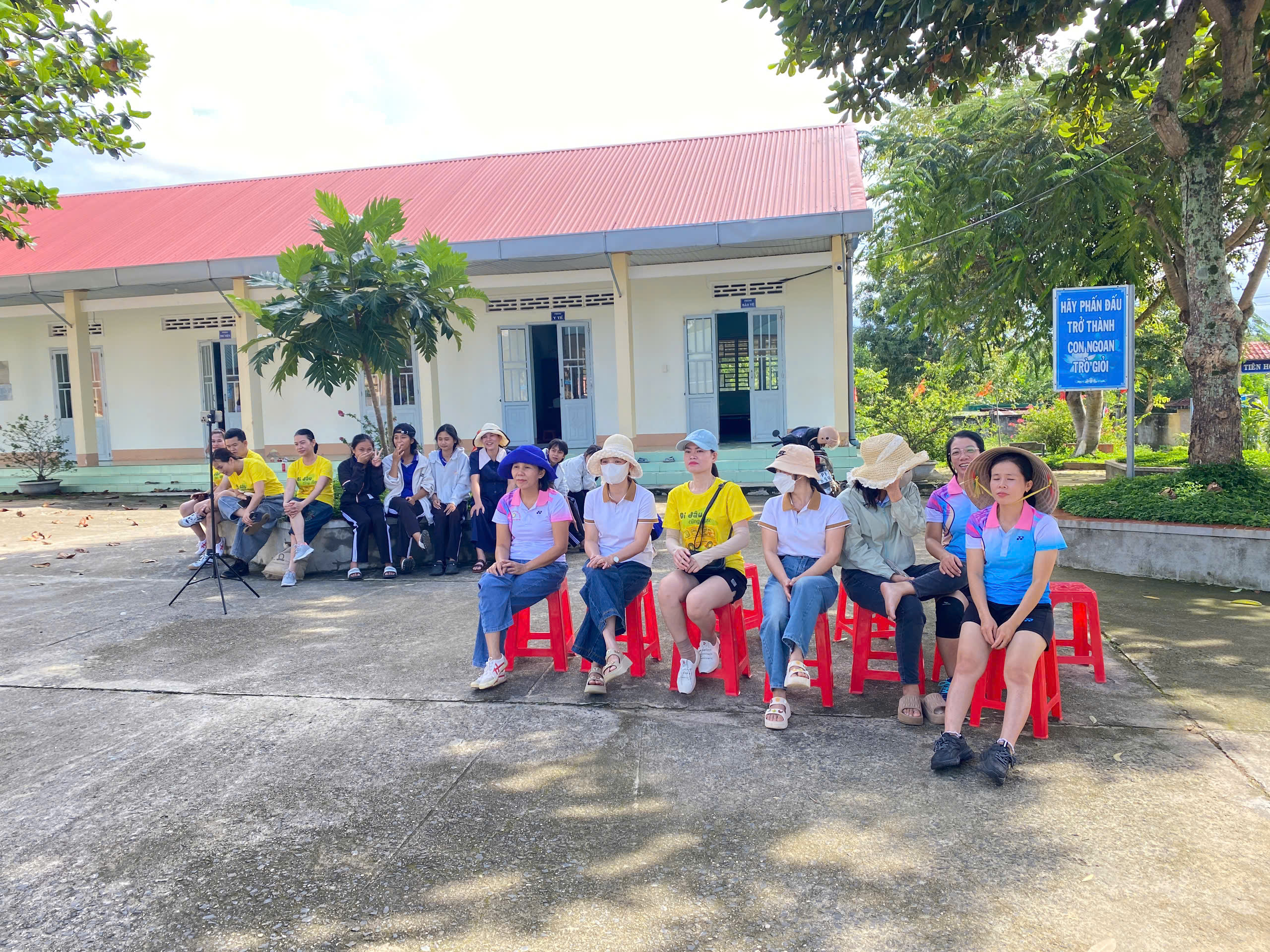 Một trong những điểm nổi bật của giải đấu chính là tinh thần đồng đội và sự cổ vũ nhiệt tình. Dưới những tán bàng già, học sinh các nhóm ngồi xếp hàng ngay ngắn, giơ cao những tấm biển cổ động do chính các em vẽ: “Cô ơi, cố lên!”, “Thầy ơi, bóng đẹp lắm!”.