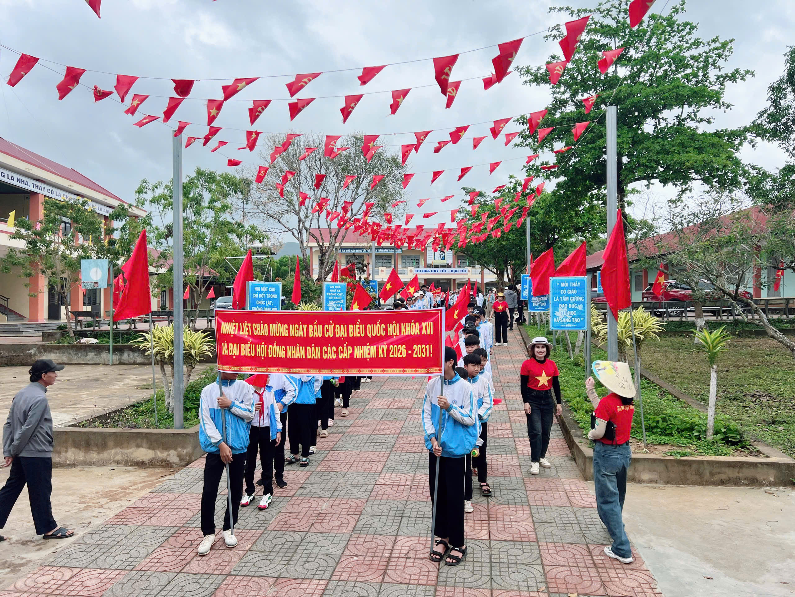 Những lá cờ đỏ sao vàng tung bay trong nắng sớm, những khẩu hiệu tuyên truyền như: “Nhiệt liệt chào mừng Ngày bầu cử đại biểu Quốc hội khóa XVI và đại biểu Hội đồng nhân dân các cấp nhiệm kỳ 2026 – 2031”, “Cử tri cả nước tích cực tham gia bầu cử”, “Ngày bầu cử là ngày hội của toàn dân”, “Sáng suốt lựa chọn những đại biểu xứng đáng đại diện cho ý chí và nguyện vọng của Nhân dân”… được các em học sinh giương cao, tạo nên hình ảnh đẹp và đầy ý nghĩa.